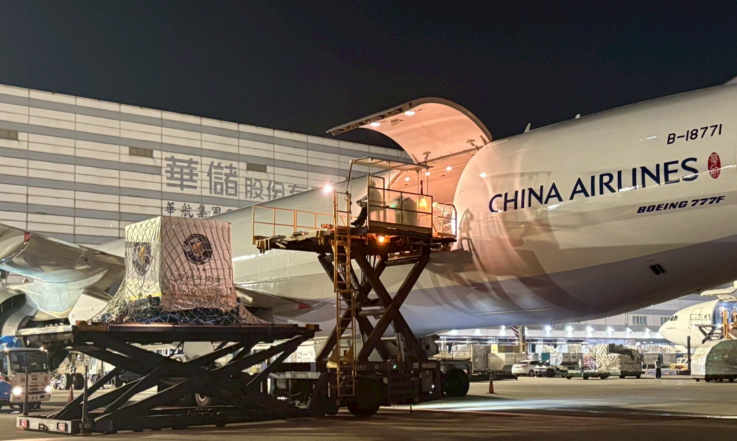 13.華航全新貨機停泊華儲空側511貨機坪前,將衛星快速運送至機邊待裝區