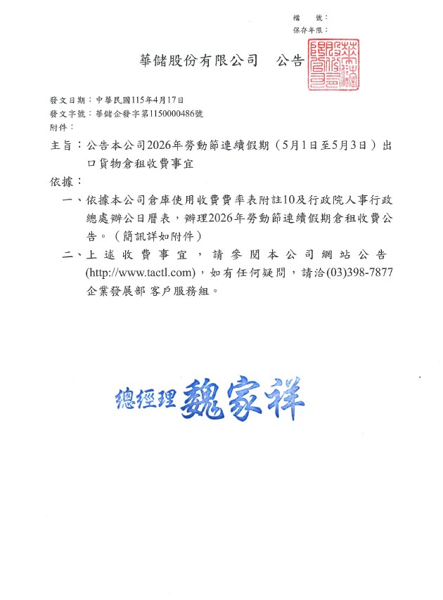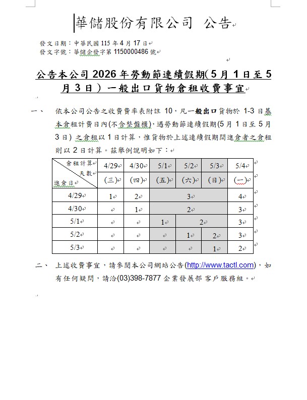 公告本公司2026年勞動節連續假期(5月1日至5月3日)一般出口貨物倉租收費事宜